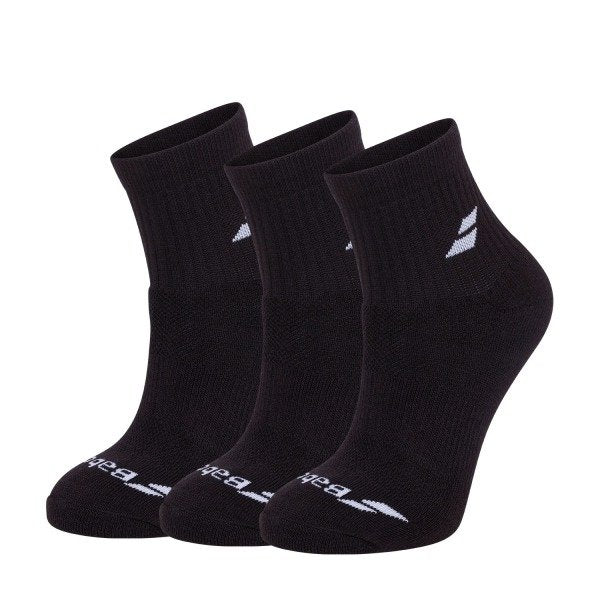The Babolat Quarter 3 Pairs Pack Socks in Black/Black are a versatile and essential addition to any athlete's wardrobe. Crafted by Babolat, a trusted and renowned name in sports equipment, these socks are designed to provide athletes with the perfect blend of comfort, support, and durability. Whether you're on the tennis court, running track, or engaged in various athletic activities, these socks offer a reliable and stylish option to keep you performing at your best.